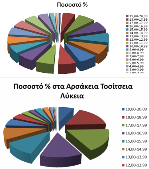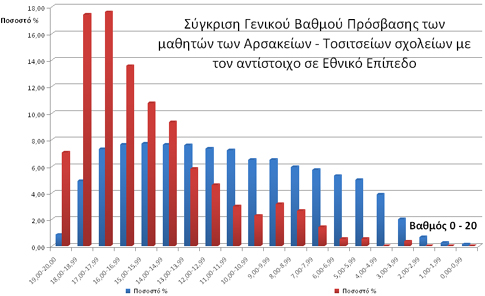 Αν εξετάσουμε το ποσοστό των μαθητών των Αρσακείων – Τοσιτσείων Σχολείων που έγραψαν από 18-20 αυτό ανέρχεται στο 24,47% έναντι 5,75% σε πανελλήνια κλίμακα.
