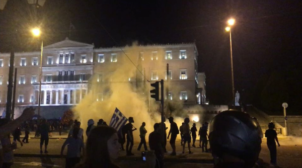 Επεισόδια σημειώνονταν μεταξύ διαδηλωτών και ΜΑΤ καθ' όλη τη διάρκεια του συλλαλητηρίου έξω από τη Βουλή