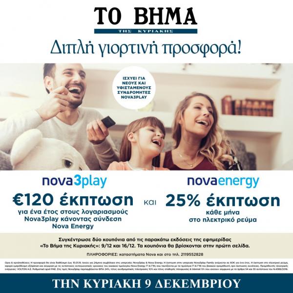 Εξοικονόμησε €120 για ένα έτος στους λογαριασμούς Nova3play –για να απολαμβάνεις τηλεόραση, internet και τηλεφωνία- κάνοντας σύνδεση Nova Energy με επιπλέον όφελος 25% έκπτωση κάθε μήνα στο ηλεκτρικό ρεύμα.