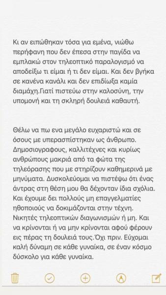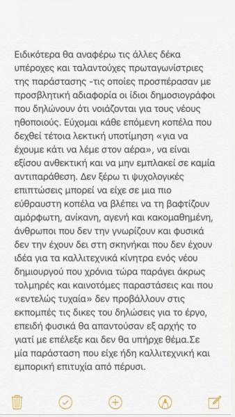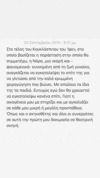 «Με μεγάλη μου χαρά σας ανακοινώνω πως θα είμαι μέρος αυτής της εξαιρετικής παράστασης με σκηνοθεσία του Νικόλα Ανδρουλάκη και σας προσκαλώ όλους να με ακολουθήσετε στο νέο μου ταξίδι…», έγραψε χαρακτηριστικά στη λεζάντα.