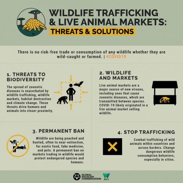 Δεδομένου των ξεκάθαρων κινδύνων που προκύπτουν τόσο για την ανθρώπινη υγεία όσο και για τη βιοποικιλότητα, οι επιστήμονες των δύο οργανώσεων ζητούν τη μόνιμη απαγόρευση της εμπορίας άγριων ζώων και των αγορών κρέατος ζωντανών ζώων.