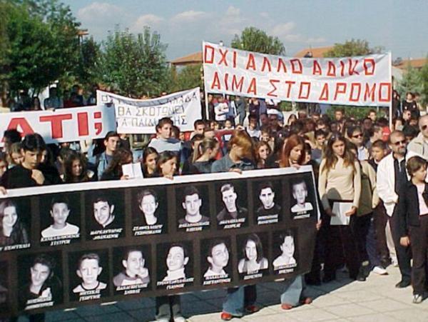 Τραγικό τροχαίο δυστύχημα με 21 νεκρούς μαθητές και 32 τραυματίες συνέβη στην περιοχή των Τεμπών, στο 386ο χιλιόμετρο της εθνικής οδού Αθηνών-Θεσσαλονίκης, το βράδυ της Κυριακής 13 Απριλίου 2003.