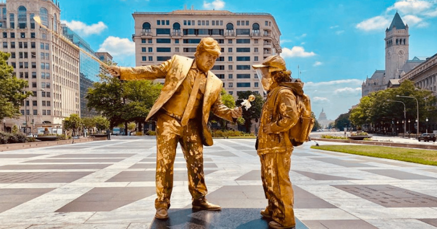 Πριν λίγες μέρες, καλλιτέχνες δρόμου, βαμμένοι με μεταλλική χρυσή μπογιά από την κορυφή μέχρι τα νύχια, πόζαραν ως αγάλματα πάνω σε βάθρα σε τρία σημεία στην Ουάσινγκτον, χαιρετίζοντας τον 45ο Πρόεδρο των ΗΠΑ ως τον «καταστροφέα των δικαιωμάτων και ελευθεριών των πολιτών».