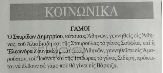 Σύμφωνα με αποκλειστικές πληροφορίες του ΤLIFE, η αγαπημένη τραγουδίστρια και ο γνωστός δικηγόρος είναι τόσο ερωτευμένοι που πήραν την απόφαση να κάνουν το επόμενο βήμα στη σχέση τους! Έτσι η Ελεωνόρα και ο Σπύρος παντρεύονται και μάλιστα την αναγγελία του γάμου τους δημοσιεύει σήμερα σε καθημερινη εφημερίδα!