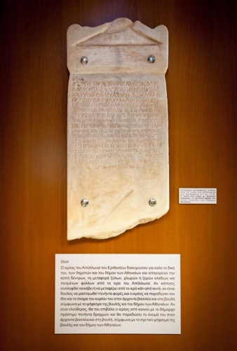 Στην επιγραφή που αντίγραφο της εκτίθεται -και καλώς έπραξε ο δήμαρχος Ζενέτος και την ανέδειξε- στην αίθουσα επισκεπτών του γραφείου του, αναγράφεται σε μάρμαρο ποιες ποινές προβλέπονταν για όσους διέπρατταν βιαιότητα κατά του περιβάλλοντος.