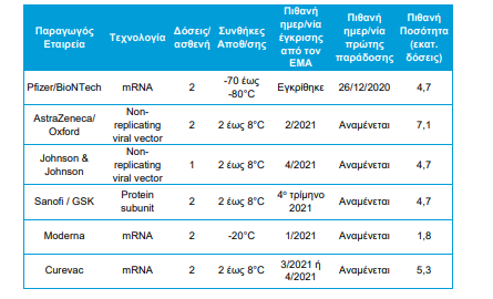 Σύμφωνα με το σχέδιο «Επιχείρηση Ελευθερία» που παρουσίασε η κυβέρνηση τον Δεκέμβριο, η Ελλάδα πρόκειται να προμηθευτεί «πιθανή ποσότητα» 1,8 εκατομμυρίων δόσεων, οι οποίες επαρκούν για τον εμβολιασμό 900.000 πολιτών.