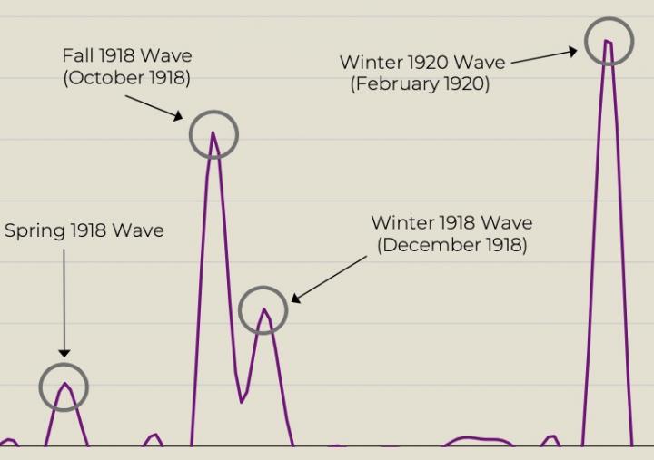 Στο γράφημα αυτό αποτυπώνονται τα τέσσερα διαφορετικά κύματα της πανδημίας του 1918 – πρώτο κύμα τον Μάρτιο του 1918, δεύτερο κύμα τον Οκτώβριο του 1918, τρίτο κύμα τον Δεκέμβριο του 1918 και τέταρτο κύμα τον Φεβρουάριο του 2020 (Siddarth Chandra, Michigan State University)