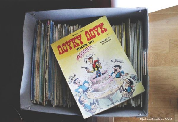 Κάλτσες με παιδικά , φωτεινά και χαρούμενα σχέδια, μια κουδουνίστρα, κόμικς Λούκυ Λουκ αλλά και αφίσες με έργα στα οποία πρωταγωνίστησε ή σκηνοθέτησε.