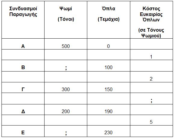 Γ5. Να κατασκευαστεί ο νέος πίνακας παραγωγικών δυνατοτήτων αν η παραγωγή του ψωμιού μειωθεί κατά 50% χωρίς να μεταβληθεί η παραγωγή όπλων. (Μονάδες 5)