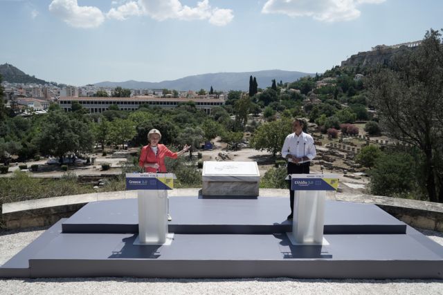 Για «ιστορική στιγμή για την Ευρώπη και την Ελλάδα», μίλησε ο πρωθυπουργός Κυριάκος Μητσοτάκης, παρουσιάζοντας, από την Αρχαία Αγορά, τις δράσεις του Εθνικού Σχεδίου Ανάκαμψης και Ανθεκτικότητας «Ελλάδα 2.0», μαζί με την Πρόεδρο της Κομισιόν Ούρσουλα φον ντερ Λάιεν.