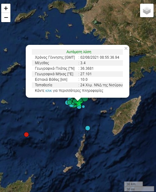Η Νίσυρος για άλλη μια μέρα αναστατώθηκε από σεισμική δόνηση. Σύμφωνα με το Γεωδυναμικό Ινστιτούτο, ο σημερινός σεισμός ήταν της τάξης των 3,4 Ρίχτερ. Το εστιακό βάθος μετρήθηκε στα 10 χιλιόμετρα, ενώ το επίκεντρο εντοπίστηκε στα 24 χιλιόμετρα νότια και νοτιοδυτικά του νησιού.