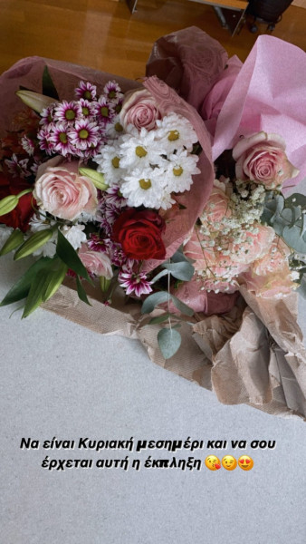 «Να είναι Κυριακή μεσημέρι και να σου έρχεται αυτή η έκπληξη», έγραψε δείχνοντας τα δύο μπουκέτα με λουλούδια που δέχτηκε.