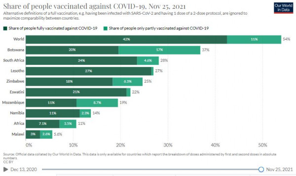 Στη γειτονική Ναμίμπια, εν τω μεταξύ -όπου οι πλήρως εμβολιασμένοι ανέρχονται μόλις στο 11%- οι αρχές προειδοποίησαν μόλις την περασμένη Πέμπτη ότι περισσότερες από 268.000 δόσεις εμβολίων της AstraZeneca και της Pfizer κινδυνεύουν να καταλήξουν στα σκουπίδια (περίπου 50.000 την επόμενη εβδομάδα), καθώς εντείνεται η διστακτικότητα των πολιτών απέναντι στα εμβόλια.