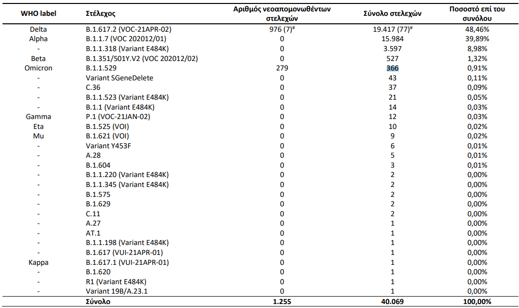 Εκ των 1.255 δειγμάτων με στελέχη ειδικού ενδιαφέροντος, τα 976 αφορούν στο στέλεχος Delta, και 279 αφορούν στο Omicron. Επτά εκ των 976 στελεχών Delta αφορούν στο στέλεχος Α.Υ.4.2, τα οποία εντοπίστηκαν σε επτά εγχώρια κρούσματα στις Περιφερειακές Ενότητες του Βορείου Τομέα Αθηνών, του Δυτικού Τομέα Αθηνών, του Κεντρικού Τομέα Αθηνών και του Λασιθίου .
