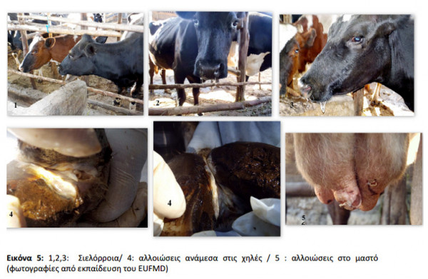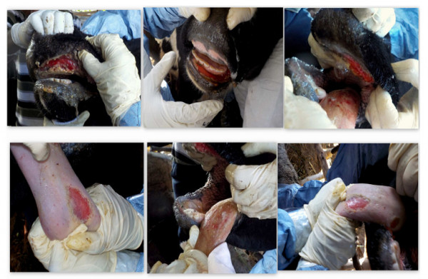 Στοματίτιδα με σιελόρροια και έντονο τριγμό των δοντιών λόγω των αλλοιώσεων (φυσαλίδες και έλκη) στα χείλη και στη στοματική κοιλότητα και του πόνου Χωλότητα λόγω των αλλοιώσεων στα κάτω άκρα και στις χηλές.