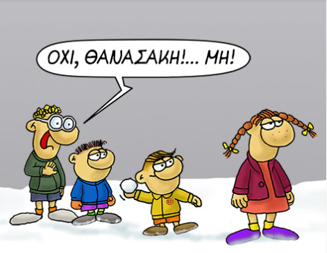 Όπως μπορείτε να δείτε στο παρακάτω σκίτσο, ο Θανασάκης σημαδεύει με μια χιονόμπαλα τη Ρόζα και εκείνος που δέχεται την εκδίκησή της είναι ο… συνήθης ύποπτος που βρίσκεται καρφωμένος στο χιόνι.