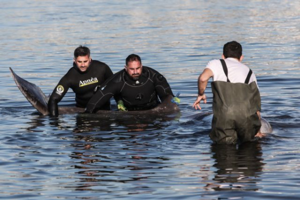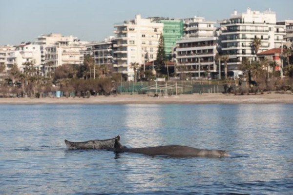 Δύσκολη είναι η μάχη που δίνουν οι αρχές για την διάσωση της φάλαινας που βρίσκεται από το πρωί λίγα μέτρα από την παραλία του Αλίμου.
