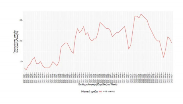 Συγκεκριμένα, την εβδομάδα αναφοράς λοιπόν (23-29 Μαΐου) το σύνολο των ασθενών ηλικίας 4-18 ετών είναι 5.451, αποτελώντας το 19% (-10% από την προηγούμενη εβδομάδα) στο σύνολο των μολύνσεων.