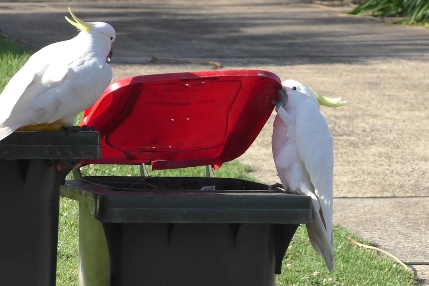 Μόνο που οι παπαγάλοι έχουν άλλη γνώμη: επιμένουν να ανοίγουν τους κλειστούς κάδους για να βρουν πεταμένες λιχουδιές.