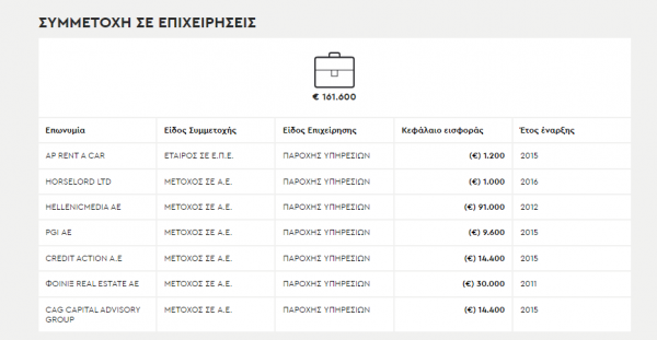 Το 2020 τα εισοδήματά του φθάνουν τα 242.000 ευρώ, οι καταθέσεις τα 2,3 εκ. ευρώ, δανεισμός 1,37 εκ. ευρώ και οι συμμετοχές σε επιχειρήσεις τα 1,33 εκ. ευρώ.