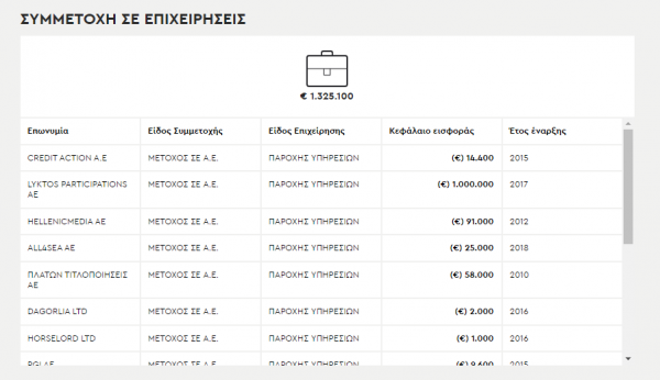 Το 2019 ξαφνικά εμφανίζεται να λαμβάνει δάνειο 1.000.000 ευρώ από ελβετική τράπεζα και να συμμετέχει με 1.000.000 ευρώ στο κεφάλαιο της εταιρείας LYKTOS PARTICIPATIONS και οι καταθέσεις του αυξάνονται σε 2,299.969,53 ευρώ από εισοδήματα προηγούμενων ετών τα οποία όμως δεν έχουν δηλωθεί στο προηγούμενο πόθεν έσχες. Επιπλέον το συνολικό μετοχικό κεφάλαιο σε επιχειρήσεις φθάνει το 1.325.100 ευρώ. Ο αριθμός τους φθάνει τις 16. Mε εξαίρεση την εταιρεία ALL4SEA στη ν οποία συμμετείχε το 2018 οι υπόλοιπες «ξεχάστηκαν» στο πόθεν έσχες του 2018 και ανάμεσά τους η LYKTOS αφού συμμετέχει σε αυτήν από το 2017. Το οικογενειακό εισόδημα υπερτριπλασιάστηκε σε 91.000 ευρώ.