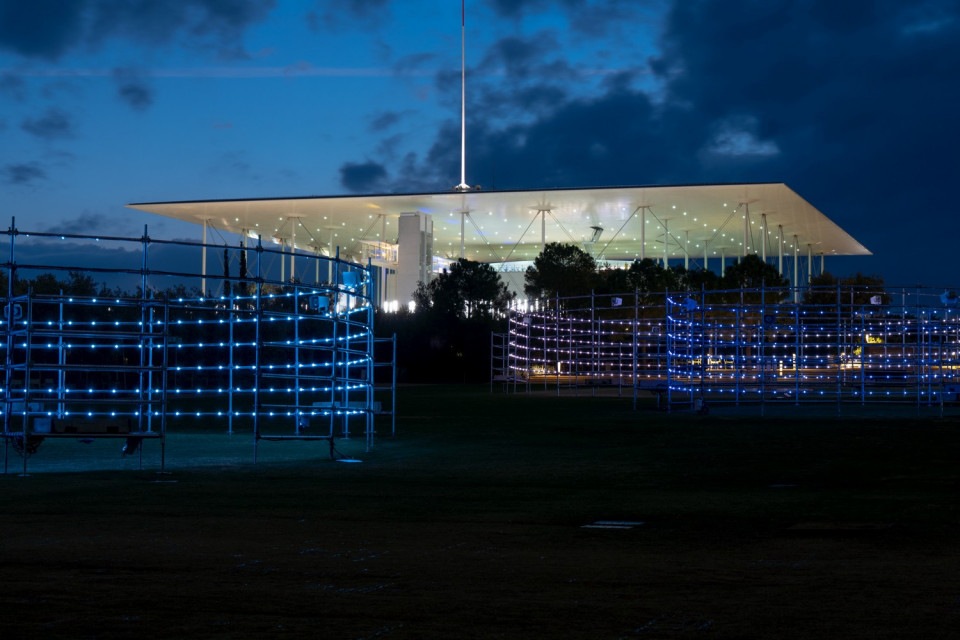 LIGHT HOLDERS Jonas Vorwerk (Wireframe, Ολλανδία) Ξέφωτο Στο Ξέφωτο οι επισκέπτες του Πάρκου Σταύρος Νιάρχος συναντούν μια φωτιστική εγκατάσταση που τους προσφέρει τη μοναδική δυνατότητα να βιώσουν την εμπειρία της μουσικής σύνθεσης με λούπες. Το έργο Light Holders αποτελεί έναν πραγματικό φόρο τιμής στα στούντιο όπου γεννήθηκαν οι μουσικές των δεκαετιών του 1950 και 1960, τότε που ο πειραματισμός με τις αναλογικές μαγνητικές ταινίες έθεσε τις βάσεις για τον σύγχρονο τρόπο μουσικής δημιουργίας. Ωστόσο, το στούντιο του Vorwerk δεν είναι κλειστό, αλλά λειτουργεί στον δημόσιο χώρο.