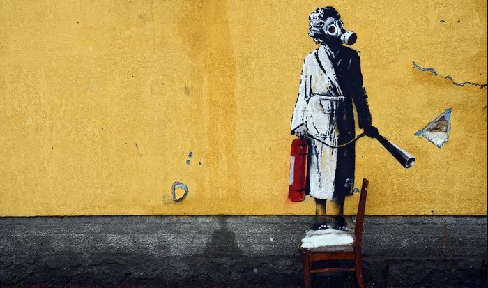 Το Reuters αναφέρει ότι το έργο τέχνης, που απεικονίζει μια γυναίκα με μάσκα αερίου και ρόμπα που κρατάει έναν πυροσβεστήρα, αφαιρέθηκε από τοίχο στη συγκεκριμένη ουκρανική πόλη στις 2 Δεκεμβρίου, σύμφωνα με αξιωματούχους.