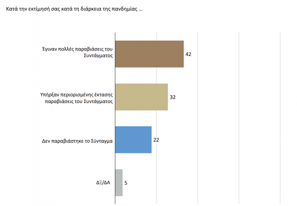 Μάλιστα οι πολίτες σε ακόμα μεγαλύτερο ποσοστό που φτάνει αθροιστικά το 74% πιστεύουν ότι κατά τη διάρκεια της πανδημίας έγιναν από περιορισμένης (32%) μέχρι μεγάλης έκτασης παραβιάσεις (42%) του Συντάγματος.