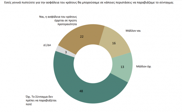 Την ίδια στιγμή πάντως εμφανίζεται μια τάση που θέλει το 61% να μην εγκρίνει την παραβίαση του Συντάγματος για λόγους ασφάλειας του κράτους. Αυτή η τάση όμως συνυπάρχει με την αντίθετη όπου σε αρκετά υψηλό ποσοστό, 38% θεωρεί ότι «ναι» και «μάλλον ναι», η «ασφάλεια του κράτους» είναι πάνω από το Σύνταγμα.