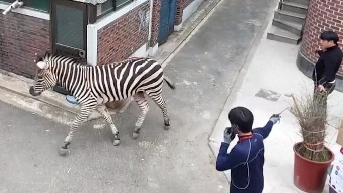 A zebra was seen walking in an alley around residential buildings after escaping from a zoo in South Korea. It was later recaptured and returned to the zoo safely. pic.twitter.com/vjCIcrRDVT