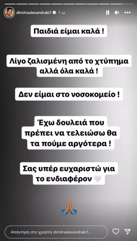 Λίγη ώρα αργότερα, η ίδια επιβεβαίωσε την είδηση με ανάρτηση στα social media, όπου έγραψε «λίγο ζαλισμένη από το χτύπημα αλλά όλα καλά. Δεν είμαι στο νοσοκομείο, έχω δουλειά που πρέπει να τελειώσω».
