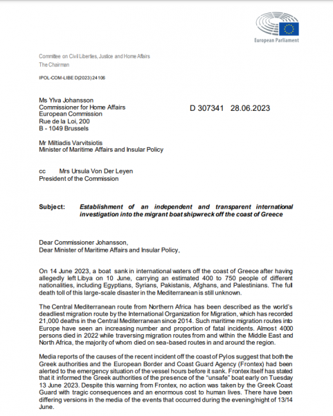 Στην επιστολή, την οποία υπογράφει ο πρόεδρός της, Juan Fernando López Aguilar, αναφέρεται πως η έρευνα είναι απαραίτητη «λόγω της έλλειψης σαφήνειας σχετικά με τα γεγονότα» και έτσι ώστε «να εξεταστούν οι ενέργειες των ελληνικών αρχών και της Frontex και η συμμόρφωσή τους με το Δίκαιο της ΕΕ και το διεθνές Δίκαιο, ιδίως με τη νομοθεσία για την έρευνα για τη διάσωση στη θάλασσα».