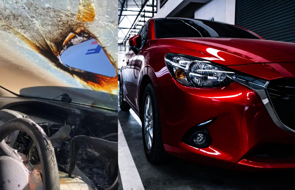 Η εν λόγω φωτογραφία που δείχνει ένα καμένο αυτοκίνητο στη Βρετανία, το οποίο έχει… τρύπα στο τζάμι κάνει τον γύρο του διαδικτύου, προκειμένου να εφιστήσει την προσοχή αναφορικά με το ποια αντικείμενα δεν πρέπει να αφήνουμε ποτέ μέσα στα αυτοκίνητα τις μέρες που έχει καύσωνα.