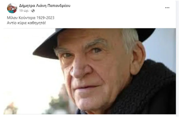 «Μίλαν Κούντερα 1929-2023. Αντίο κύριε καθηγητά!», έγραψε στην ανάρτησή της.