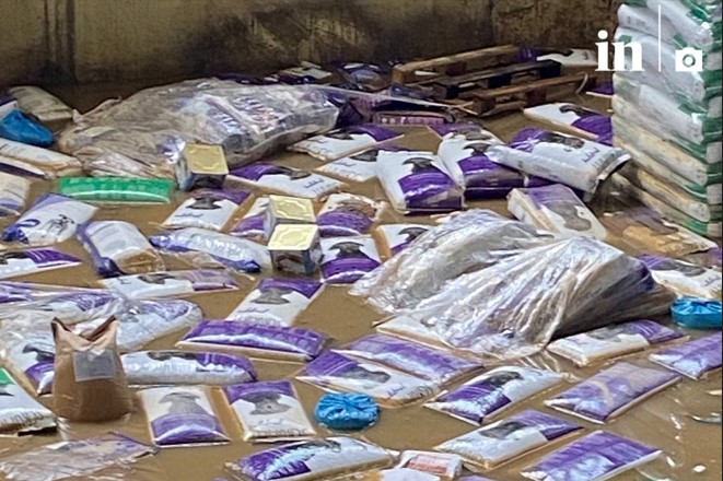 Στις φωτογραφίες και τα βίντεο που δημοσιεύει το in φαίνεται ο χώρος γεμάτος λάσπη με τα τσουβάλια της παραγωγής να επιπλέουν.