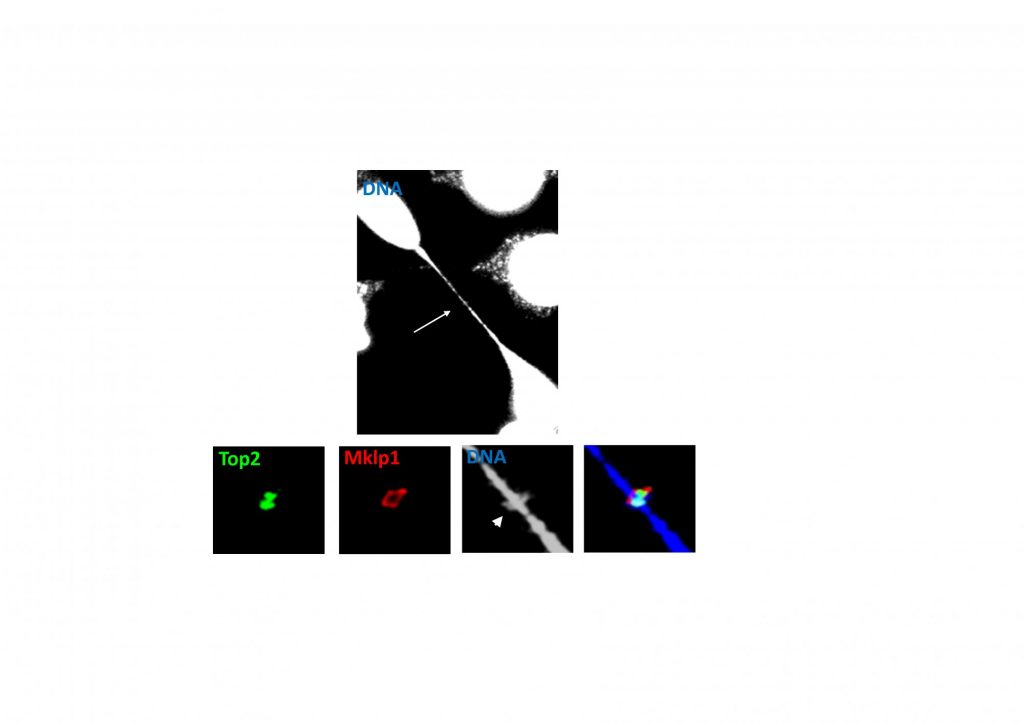 Εικόνα δύο ανθρώπινων καρκινικών κυττάρων που ενώνονται με γέφυρα DNA (μεγάλο βέλος), η οποία ελήφθη με συνεστιακή μικροσκοπία υψηλής ανάλυσης. Τα ένθετα δείχνουν τον κόμπο του DNA (μικρό βέλος) καθώς και πρωτεΐνες που εντοπίζονται επάνω σε αυτόν για να εμποδίσουν το σπάσιμο της γέφυρας (δρ. Πετσαλάκη και καθηγητής Γεώργιος Ζάχος, Πανεπιστήμιο Κρήτης)