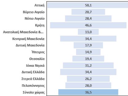 Ειδικότερα, ωστόσο, από το σύνολο των γυναικών του δείγματος που κατοικούν στην Αττική, μία στις δύο γυναίκες δηλώνει ότι έχει υποστεί σωματική ή σεξουαλική βία, ενώ υψηλά ποσοστά δηλώνονται και από τις γυναίκες που κατοικούν στην Κρήτη (46,6%), στην Κεντρική Μακεδονία και τη Δυτική Ελλάδα (34,4%) αλλά και στα Ιόνια Νησιά (31,2%).