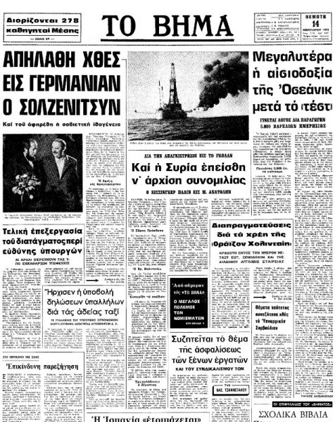Μέσα στην πρώτη βδομάδα, είδαμε το θέμα Σολζενίτσιν να περνάει —σε τρεις και μόνον ημέρες— από την πρώτη σελίδα στην τρίτη, από το προσκήνιο στο δεύτερο πλάνο, ύστερα στο τρίτο. Πάλι καλά που συντηρείται ακόμα, κουτσά-στραβά. Δεν φταίει ο Τύπος. Ο Τύπος ανταποκρίνεται στην ψυχολογία της κοινής γνώμης. Αύριο-μεθαύριο ο Σολζενίτσιν θα γίνει κοινοτοπία, θύμα της συνήθειας. Ένα μόνο θέμα στέκεται σταθερά στο προσκήνιο, κρατάει μόνιμα τις πρώτες σελίδες. Μη γελιόμαστε: είναι η πολιτική. Από το πρίσμα τούτο αν κρίνει κανένας τη σοβιετική καταδικαστική απόφαση, θα ιδεί πως είταν πολύ καλά μελετημένη.
