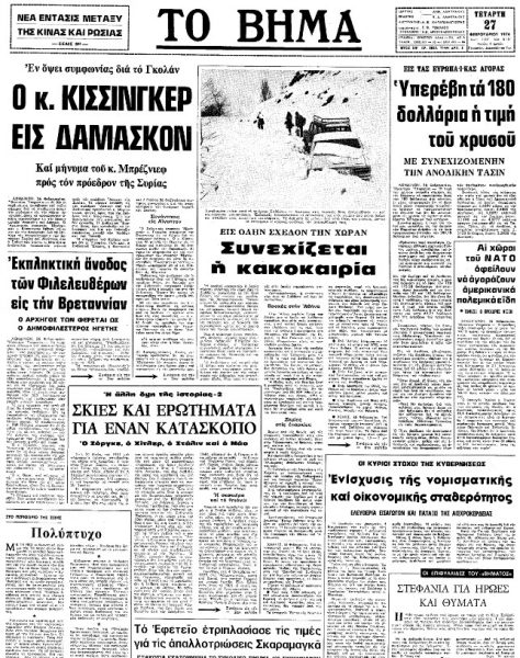 Στο πρωτοσέλιδο του «Βήματος» που είχε κυκλοφορήσει την Τετάρτη 27 Φεβρουαρίου 1974 υπήρχε μια επιφυλλίδα του Άγγελου Τερζάκη αφιερωμένη στον Σολζενίτσιν, ο οποίος είχε απελαθεί πρόσφατα από τη χώρα του. Ο τίτλος του έξοχου κειμένου του Τερζάκη ήταν ο ακόλουθος: «Στεφάνια για ήρωες και θύματα».