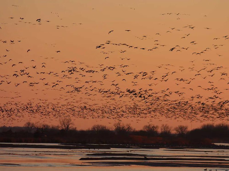 Τα πουλιά φωλιάζουν στις αμμώδεις ράχες του ποταμού τη νύχτα, και στη συνέχεια πετούν στον ουρανό με την ανατολή του ήλιου και κατευθύνονται προς τα γειτονικά χωράφια καλαμποκιού