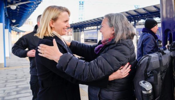 Η πρεσβευτής των ΗΠΑ στην Ουκρανία, Μπρίτζετ Μπρινκ (αριστερά), και η αμερικανίδα τότε αναπληρώτρια υπουργός Εξωτερικών, Βικτόρια Νούλαντ, στο Κίεβο, στις 31 Ιανουαρίου 2024
