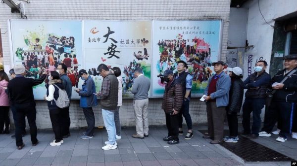 Ψηφοφόροι σχηματίζουν ουρά έξω από ένα εκλογικό τμήμα στην Ταϊπέι, την πρωτεύουσα της Ταϊβάν, στις 13 Ιανουαρίου 2024