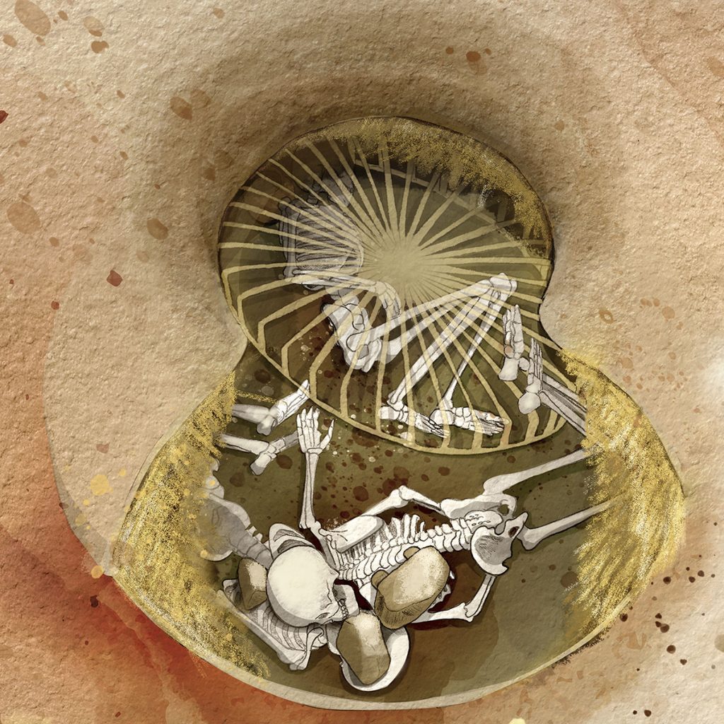 Στην κατασκευή των 5.600 ετών, μια γυναίκα βρέθηκε ξαπλωμένη στο πλάι με τα γόνατα ελαφρώς λυγισμένα. Οι άλλες δύο κείτονταν σε αφύσικες στάσεις, καλυμμένες με σπασμένες μυλόπετρες.
