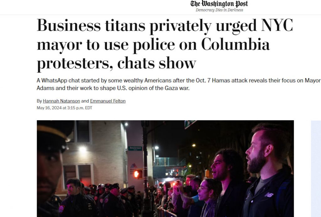 Αντισημιτικό χαρακτήρισαν φιλοϊσραηλινοί κροίσοι, αλλά και ο ίδιος δήμαρχος της Νέας Υόρκης ρεπορτάζ της Washington Post που αποκάλυπτε υπόγειες δραστηριότητες επηρεασμού της κοινής γνώμης υπέρ του Ισραήλ, παρά τις σφαγές που επιδίδεται στη Λωρίδα της Γάζας.