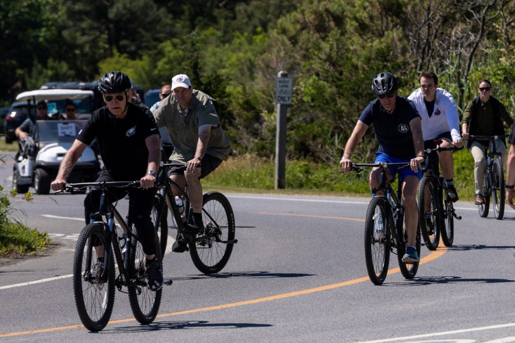 Σε μια σημειολογική κίνηση στήριξης, ο Αμερικανός πρόεδρος Μπάιντεν και ο γιος του, Χάντερ, κάνουν μαζί βόλτα με ποδήλατα στο Ντέλαγουερ, το Σαββατοκύριακο, προπαραμονή της έναρξης της δίκης (REUTERS/Anna Rose Layden)