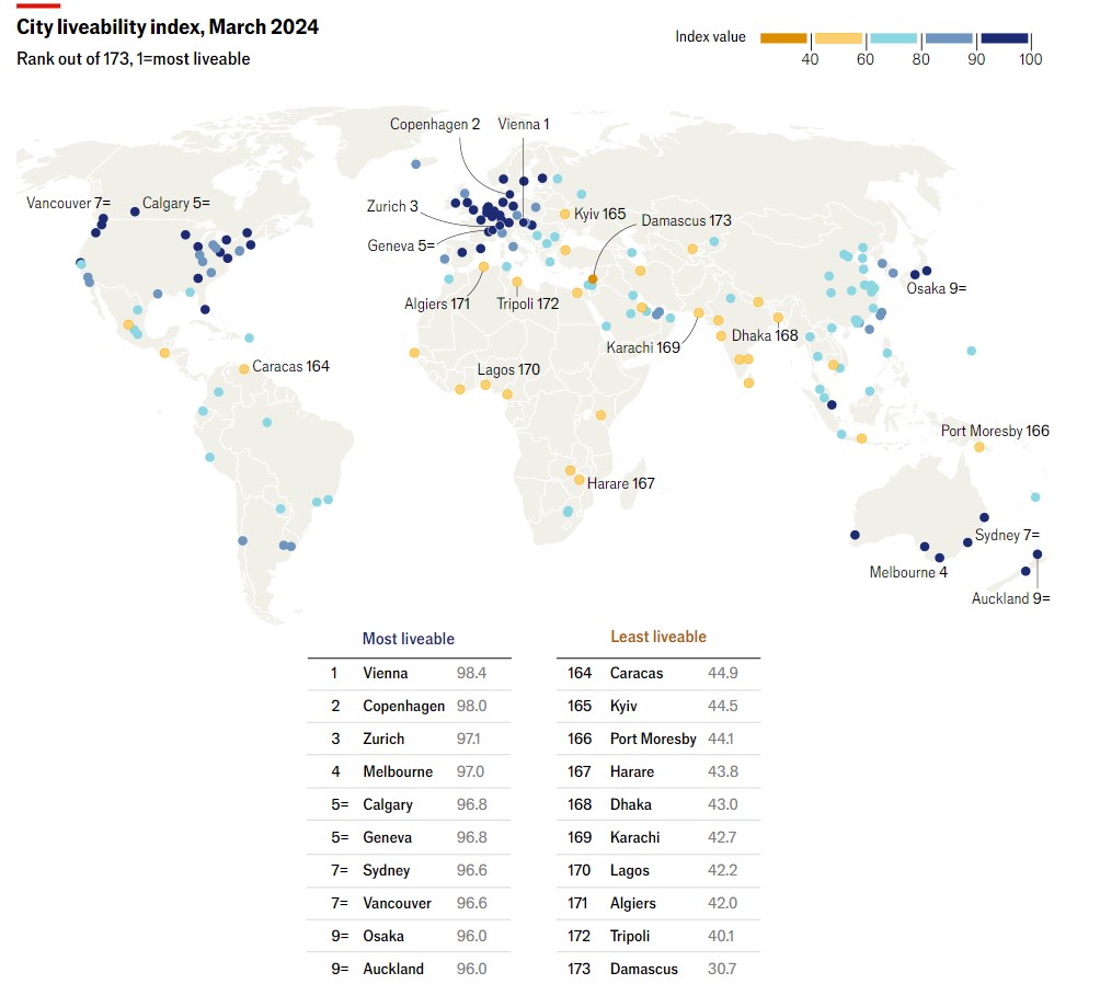 Η Βιέννη κατέκτησε την πρώτη θέση και πάλι το 2024, κερδίζοντας τον τίτλο της πιο βιώσιμης πόλης στον κόσμο για τρίτη συνεχή χρονιά. Η αυστριακή πρωτεύουσα έλαβε άριστη βαθμολογία σε τέσσερις από τις πέντε κατηγορίες του δείκτη, αλλά η έλλειψη μεγάλων αθλητικών εκδηλώσεων συνέβαλε στη χαμηλότερη βαθμολογία της, 93,5 στα 100 στην κατηγορία πολιτισμός και περιβάλλον.