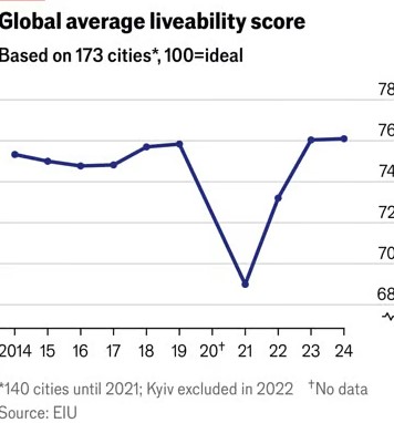 Το Κίεβο έχει επίσης κακές επιδόσεις σε αυτή την κατηγορία, γεγονός που το ωθεί στην τελευταία δεκάδα των πόλεων του δείκτη για δεύτερη συνεχή χρονιά. Το Τελ Αβίβ μοιράζεται την ίδια κακή βαθμολογία σταθερότητας και οι βαθμολογίες του στις υποδομές και στον πολιτισμό και το περιβάλλον μειώθηκαν κατά 7,2 και 6,7 μονάδες αντίστοιχα εν μέσω του πολέμου στη Γάζα. Η ισραηλινή πόλη υποχώρησε 20 θέσεις στην κατάταξη στην 112η θέση, η μεγαλύτερη μετατόπιση στη φετινή έρευνα.