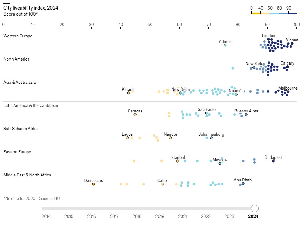 Η ετήσια έρευνα αξιολογεί 173 πόλεις σε πέντε κατηγορίες: σταθερότητα, υγειονομική περίθαλψη, πολιτισμός και περιβάλλον, εκπαίδευση και υποδομές. Ο χάρτης και τα διαγράμματα που ακολουθούν δείχνουν πώς συγκρίνονται οι πόλεις φέτος.