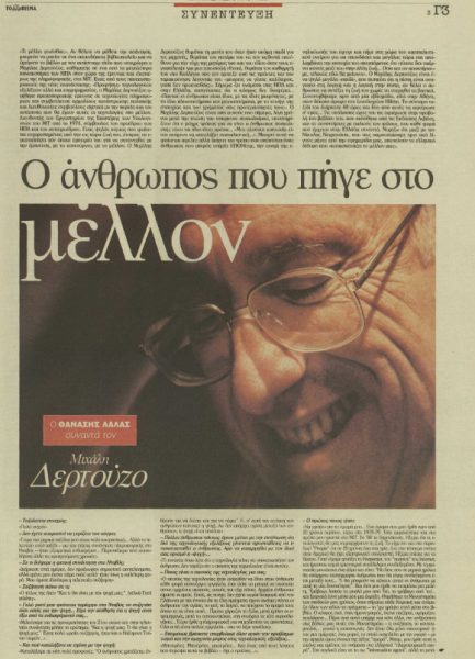*Απόσπασμα από συνέντευξη που είχε παραχωρήσει ο αείμνηστος Μιχάλης Δερτούζοςστον Θανάση Λάλα και είχε δημοσιευτεί στην εφημερίδα «Το Βήμα» την Κυριακή 22 Φεβρουαρίου 1998.