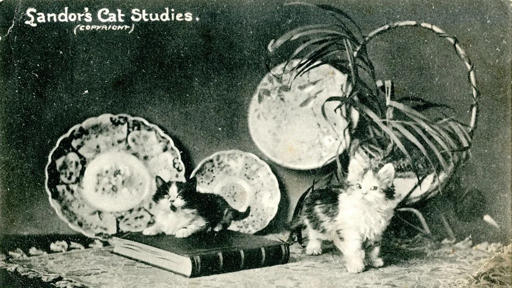 Γάτες εμφανίζονταν στις καρτ-ποστάλ να κάνουν γατίσια πράγματα όπως να πίνουν γάλα από το πιατάκι ή να παίζουν με ένα κουβάρι. Σε άλλες περιπτώσεις εμφανίζονταν ντυμένοι άνθρωποι να σχολιάζουν τα κοινά.